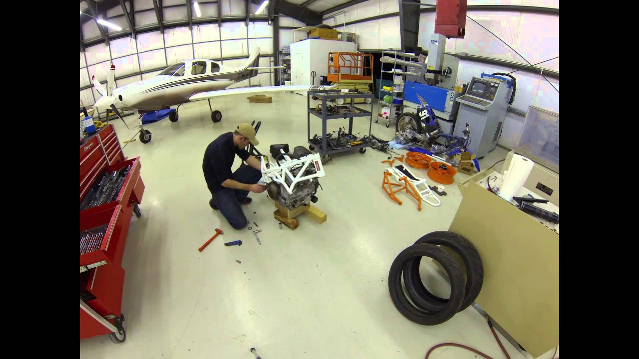 Na filmie (wykonanym technologią poklatkową) zobaczycie proces składania motocykla od samego zera. Wystarczy tylko trochę samozaparcia, a do tego odpowiednie narzędzia i kawałek warsztatu (w tym przypadku wypasionego hangaru z samolotem i motorówką) oraz odpowiednia organizacja pracy. Proces, który widzicie na filmie, zajął cztery wieczory pracy na luzie. Ciekawe, czy zostało mu kilka wolnych śrubek i podkładek…