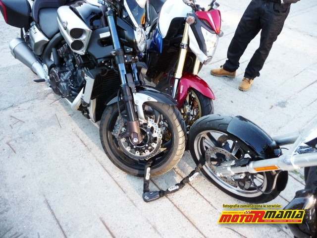 że mogliśmy poruszać się tylko za dnia, nie pozwalając sobie ani na chwilę relaksu za kierownicą. Honda CB1000R zaczęła wariować po tym jak opaska mocująca zestaw kluczy puściła przez co płaska 10’tka powodowała zwarcie na akumulatorze. Po kilku lotach przez wyrwy podgięta tylna felga Yamahy Vmax zaczęła przepuszczać powietrze, ale to ciągle nic w porównaniu do ciosu, który przyjął Harley. Na szczęście incydent miał miejsce tuż przed powrotem do Polski. Ukraińscy drogowcy zastawili pułapkę na V-Roda w postaci wyciętego kwadratu asfaltu o wymiarach 1×1 metr i głębokości jakichś 20cm. W efekcie zgięły się obydwie felgi, jeden tylny amortyzator oraz puściło mocowanie osłony zbiornika paliwa.