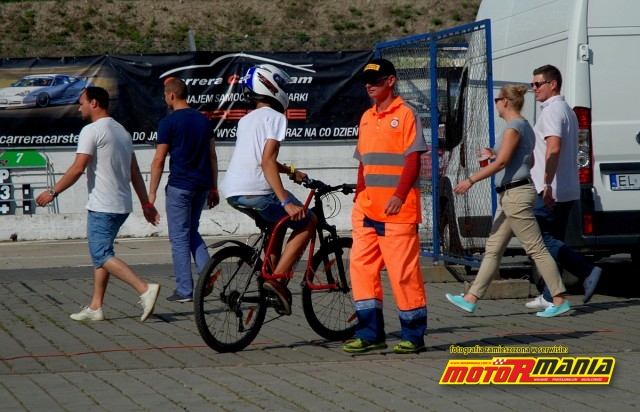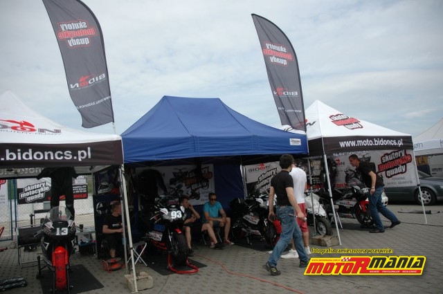 Po parku maszyn chodzi, biega i jeździ mnóstwo ludzi i pojazdów, więc trzeba uważać. Motocykle zjeżdżające z toru, dzieci, psy, ludzie niosący stojaki do motocykli, koła lub opony, lawirujący między nimi skuterzyści z gołymi głowami, kolanami i łokciami – taka najwygodniejsza opcja na transport wewnętrzny po tym przestronnym terenie. Padokowe panny patrzą uważnie pod nogi, bo na betonowej kostce trudno się chodzi w przewysokich szpilach. Ponad głowami tej zaaferowanej masy ludzi śmignie czasem wysoka sylwetka Marcina Kondratowicza na rowerze. W okolicach wielkiego czarnego tira z ogromnym logo „MotoRmania” na boku natrafić można na