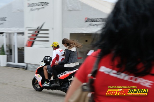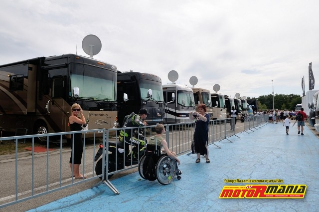 zawodnicy stają się mało osiągalni. Ci najbardziej oblegani, muszą się ratować szaleńczą jazdą skuterami w drodze boks <–> mobile home i taśmami odgradzającymi dziki tłum. Mimo taśm, ochroniarze, z których usług korzysta m.in. Rossi, mają pełne ręce roboty dzięki kibicom wyznającym zasadę: co mi taka taśma, stanę cichutko przy skuterze, skurczę się i może mnie nie zauważą. Jest on jedynym zawodnikiem, którego pojawienie się słyszysz stojąc nawet 100 metrów dalej. Owacja fanów jest ogłuszająca i nie da się jej przegapić. Dziki tłum nie odpuszcza i potrafi stać godzinami byle tylko zobaczyć z bliska Valentino, Jorge czy Daniego (który notabene nie korzysta z żadnych zabezpieczeń – jest tak niski, że przemyka często niezauważony). Sława potrafi być męcząca, a tysiące zdjęć z wielbicielami najprostszą drogą do zmarszczek mimicznych. Dosyć ciekawym zjawiskiem są kolekcjonerzy – handlarze. Ze zdziwieniem przyglądałam się panu, który warował kolejno przy każdym boksie z czarną aktówką w której, jak podejrzałam, każdy z zawodników miał swoją przegródkę a w niej po kilka zdjęć. Pan zbiera autografy, a potem jego kreatywna, jednoosobowa firma wystawia takie zdjęcia na sprzedaż (nie masz pomysłu na biznes? olej dofinansowanie z Urzędu Pracy i zacznij jeździć na MotoGP).