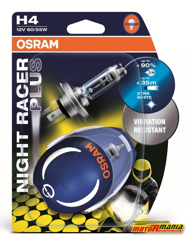 OSRAM NIGHT RACER PLUS to żarówka, która pozwala uzyskać aż do 90% więcej światła na drodze i daje do 35 metrów dłuższy zasięg reflektorów. Opatentowana niebieska powłoka pierścienia zmniejsza olśnienie pojazdów nadjeżdżających z przeciwka. Ponadto pomaga lepiej skupić wiązkę światła na drodze. Barwa tej żarówki jest o 10% bielsza niż standardowa przez co poprawia kontrast i zmniejsza zmęczenie oczu.