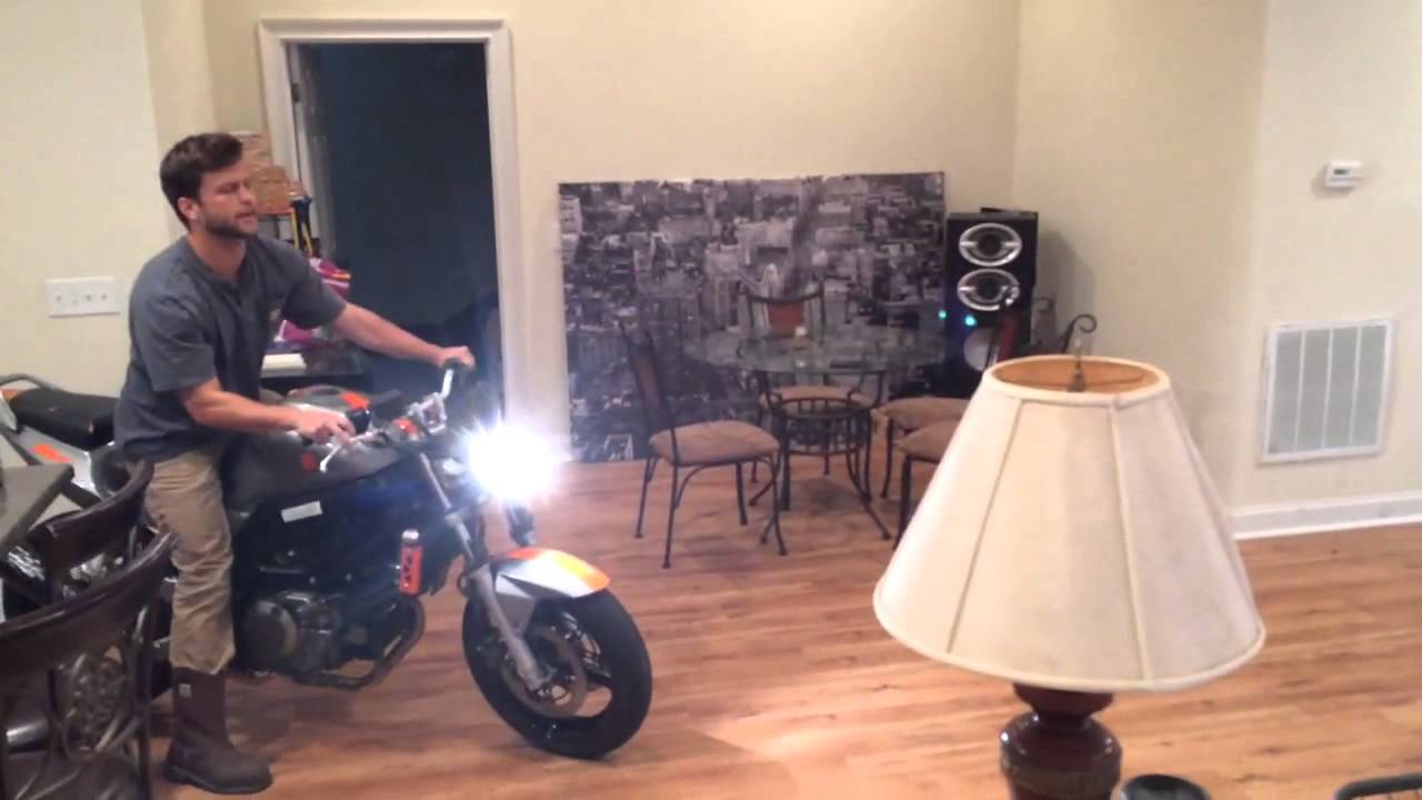 Dlaczego ten gość postanowił dać na koło motocyklem w mieszaniu? Nie wpadł na to, że panele/parkiet to dość śliskie podłoże? Gdyby nawet mu się udało podnieść przednie koło, to co dalej? No i dlaczego ma na nogach buty Emu?
