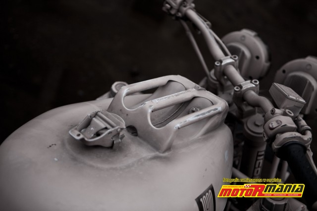 właściwości offroadowe. Wszelkie plastiki zostały zastąpione stalowymi klatkami i płytami, które teraz znacznie lepiej chronią kluczowe podzespoły. Robiony na zamówienie, powiększony zbiornik paliwa, specjalne oświetlenie oraz dodatkowe baterie jeszcze bardziej zwiększają zakres możliwości motocykla. Na sam koniec, stelaże z przodu i z tyłu dają możliwość transportowania niezbędnego zaopatrzenia i amunicji. Przyjrzyjcie mu się, zwróćcie uwagę na wszystkie szczegóły. Kanister, światła, rama…