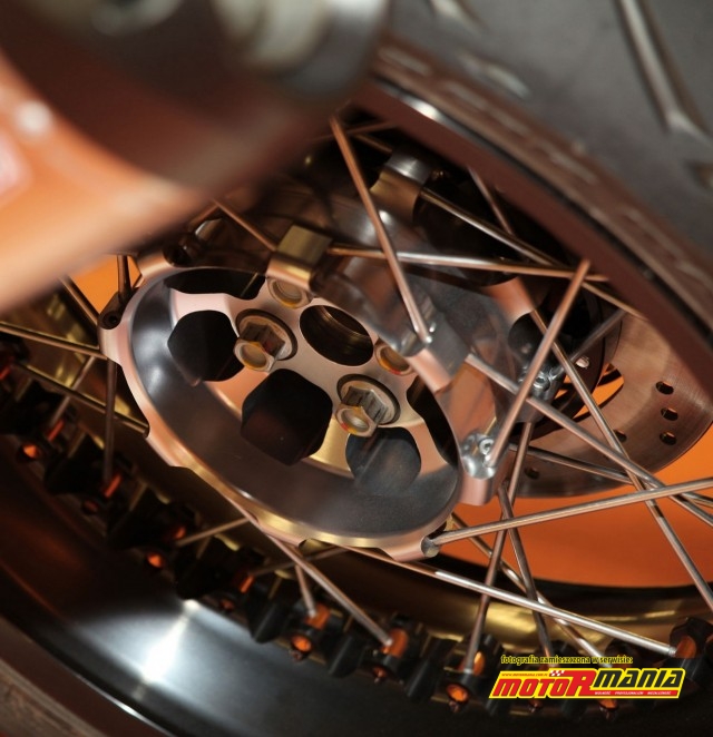 Poza tym, na pokładzie Motarda V-Twin znalazło się sporo innych, ciekawych dodatków. Są kute, aluminiowe felgi Kineo, w których mocowanie szprych rozwiązano w taki sposób, że bez problemu można stosować opony bezdętkowe, do tego zawieszenie jest oczywiście w pełni regulowane, a za wytracanie prędkości odpowiadają radialne zaciski Brembo.