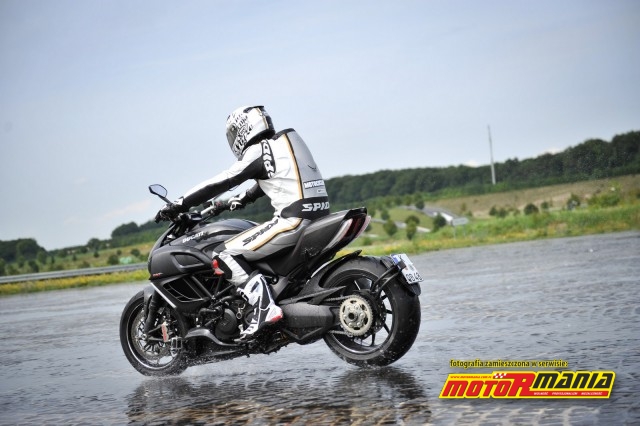W żadnych okolicznościach nie byliśmy w stanie pobić systemu ABS. W suchych i przyczepnych warunkach radziliśmy sobie z podnoszeniem tyłu zanim system wkraczał do akcji, ale radził sobie lepiej ze zmianą nawierzchni i przyczepnością. Diavel jest stabilny nawet przy ABSie pracującym na koleinach. Kolejna generacja systemu, opracowywana aktualnie przez Bosch, ma zamiar rozwiązać problem zmiany kierunku i hamowania jednocześnie. Poziom zaawansowania także rośnie, dodając parametry z kontroli trakcji Boscha oraz żyroskopy. To oznacza, że ostatnia strefa jazdy nie kontrolowana do tej pory przez komputer – hamowanie i jednoczesne wejście w zakręt, teraz także będzie przebiegać pod jego dyktando.