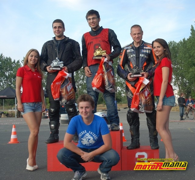 W klasie mini także nie było zaskoczenia – z dużą przewagą wygrał DrMarino Mariusz Juszczak z Krakowa (Aprilia RS125), który, przypomnę, zwyciężył w kategorii amatorów w ogólnopolskich zawodach GymkhanaGP w Szczecinie miesiąc temu. W dwóch bezbłędnych przejazdach osiągnął czasy 1:09,64 i 1:08,39. Drugi był Przemek Półchłopek z sumą czasów 2:25,18, a trzeci Piotrovsky Piotr Piszczek (2:29,04). Najwyżej sklasyfikowaną, a zarazem jedyną dziewczyną startującą w zawodach została Grzanka Agnieszka Jaszewska z Wrocławia – 6 miejsce w klasie mini.