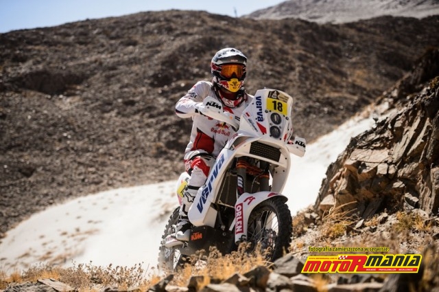 ryzyko zabłądzenia na pustyni. Jeszcze przed startem Kuba Przygoński zastanawiał się jak trafić w odpowiedni czas by jutro móc atakować z dobrego miejsca. Udało mu się to idealnie, jutro na trasę wyruszy w szybkiej grupie. W stawce motocyklowej szybcy okazali się kierowcy z Chile, aż trzech z nich znalazło się w pierwszej czwórce. Zwyciężył Chaleco Francisco Lopez, lokalna gwiazda z kraju goszczącego metę rajdu. Tylko o sekundę gorszy okazał się Holender Frans Verhoven, a pięć sekund za nimi przyjechał Pablo Quintanilla, który wytyczał tempo przez większość etapu. Wymieniany jako faworyt zawodów – Cyril Despres był 5., do lidera traci tylko 13 sekund.