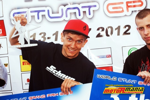 się indywidualnym stylem. Do finału przeszło 17 zawodników. Ostatecznie, oprócz Rafała Pasierbka czyli Stuntera 13, w finałowej trójce znaleźli się Arunas Gibieza z Litwy (508 pkt) oraz Marcin „Korzeń” Głowacki z Polski (503 pkt). Ten ostatni przypieczętował swój status wschodzącej gwiazdy. Postępy młodego Polaka są imponujące i podczas sobotnich kwalifikacji był niezwykle groźnym przeciwnikiem zachowującym dużą płynność w przejściach pomiędzy trickami. Niestety nieco gorzej poszło mu w niedzielnym finale, podczas którego zaczął padać deszcz. Tutaj płynność jazdy nie była idealna, a próby zaskoczenia sędziów czymś szczególnym zostały storpedowane niską przyczepnością. Ostatecznie „Korzeń” musiał zadowolić się ostatnim miejscem na pudle, co jest i tak ogromnym osiągnięciem. Arunas Gibieza, pomimo fatalnej pogody, zaskoczył wykonaniem kilku cyrkli z nogami powyżej poziomu kierownicy co prawdopodobnie przypieczętowało jego niewielką przewagę nad Marcinem. Niezawodnym graczem okazał się jednak Rafał Pasierbek, który nie zważając na mokry asfalt dał popis swoich niezwykłych umiejętności. To, że nikt inny nie prezentuje takiej płynności i synchronizacji z motocyklem było oczywiste nawet dla osób nieinteresujących się stuntem. Stunter13 jak zwykle pokazał ogromny kunszt i doskonale wykonał pełną gamę tricków z każdego sektora. Pokusił się nawet o niezwykle ryzykowny w trudnych warunkach Kangaroo Jump, czyli zakończenie jazdy na przednim kole efektownym złamaniem maszyny, wyrwaniem jej w powietrze i przeskokiem na tylne koło. Zresztą, zobaczcie sami. Na stronach MotoRmanii możecie już znaleźć kilka materiałów filmowych ze StuntGP: