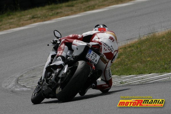 Motocykl wydaje się maleństwem, ale za kierownicą jest zaskakująco dużo miejsca. Spodziewaliśmy się spartańsko sportowej pozycji, a tymczasem jest tak wygodnie, jak na Suzuki GSX-R1000 lub Firebladzie. Doskonale wyprofilowany zbiornik paliwa pozwala na wygodne ułożenie kolan i przesunięcie się do tyłu. Osoby poniżej 190 cm wzrostu nie powinny mieć problemów ze schowaniem się za przednią szybą. Wyjazd z depo i gwałtowne otwarcie rolgazu do końca zabiera nas dynamicznie przez środkowy zakres obrotów, a kiedy wskazówka przekracza 10.000 obr./min. przednie koło odrywa się gwałtownie od ziemi. Do wspomnianej granicy na poziomie 10.000 obr./min. wzrost mocy wydaje się być idealnie progresywny, a „mocniejsza” końcówka dodaje maszynie emocjonalnego animuszu. Pierwsze okrążenia warto przejeżdżać płynnie, więc RSV4 R była utrzymywana na wysokich biegach. Okazało się, że w najwolniejszym zakręcie, tzw. „Sławiniaku” motocyklowi zupełnie nie przeszkadza, kiedy obroty spadną do 6000 na trzecim biegu. Moment obrotowy Aprili wyciąga ją ze złożenia z łagodnością olbrzyma i zdecydowanie buduje prędkość w kierunku następnego zakrętu. Doskonałe opony Metzeler Interact K3 już po jednym okrążeniu pozwoliły poczuć się na tyle pewnie, aby rozpocząć właściwą jazdę testową.