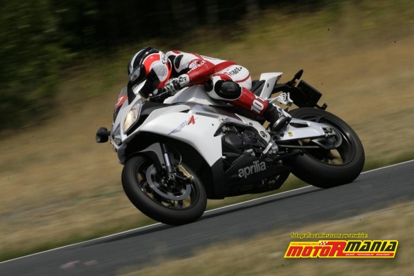 Dopiero odpowiednie zarządzanie przełożeniami pozwoliło docenić potencjał tego silnika. Tym razem wyjście ze „Sławiniaka” na „dwójce” przy 6-7000 obrotów powodowało, że opona wpijała się w asfalt katapultując motocykl do przodu i unosząc przednie koło kilka centymetrów nad ziemią. Wtrysk paliwa nie ma może fenomenalnej subtelności Ducati 1098, ale jest niezwykle precyzyjny. Dozowanie paliwa oferuje dokładność przekładającą się na totalną kontrolę. Pomimo coraz bardziej dynamicznych otwarć rolgazu, jedyny uślizg tylnego koła przydarzał się na przejeździe przez rozlany wcześniej olej. Tutaj można było sprawdzić, jak dokładnie reaguje silnik. Chwilowe zamrożenie rolgazu momentalnie zwalniało uślizg tyłu i pozwalało kontrolować slajd, a następnie, kiedy nawierzchnia znowu była przyczepna, kontynuować przyspieszanie. Jeżeli można się o coś przyczepić, to będzie to moc maksymalna – na prostych motocykl minimalnie ustępował licznym Yamahom R1 znajdującym się w tym samym czasie na torze – co nie zmienia faktu, że doskonały środek obrotów powodował, iż Aprilia znacznie szybciej wychodziła z zakrętów, niż Yamahy. Skrzynia biegów pracowała cicho i precyzyjnie – podczas testu ani raz nie natrafiliśmy na fałszywy międzyluz i nie przytrafiło nam się żadne wybicie biegu. Jeszcze wyżej niż silnik oceniamy podwozie i to, pomimo iż motocykl nie jest wyposażony w zawieszenie Ohlinsa.