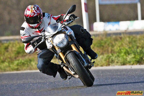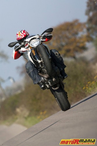 odkręceniu rolgazu następuje szok. Dolna skala obrotów, jest mocna, ale w przedziale do 3-3,500 obr./min. nie dzieje się jeszcze nic sensacyjnego. Kiedy tylko elektroniczny obrotomierz zbliża się do poziomu 4000, zaczyna się festiwal momentu obrotowego. Tłoki pracują jakby fizyka przestała obowiązywać. Zdecydowane otwarcie rolgazu powoduje, że przednie koło błyskawicznie unosi się do góry. Nie chodzi tutaj o lekkie oderwanie się od ziemi. Monster gwałtownie zmienia sposób podróżowania z horyzontalnego na wertykalny. Na poziomie 6000 obr./min. mamy do czynienia z największą wartością momentu, i jeżeli nie zmniejszymy otwarcia gazu, lub nie naciśniemy tylnego hamulca to zaliczymy back-flipa szybciej niż Dani Pedrosa podczas awarii launch-control.