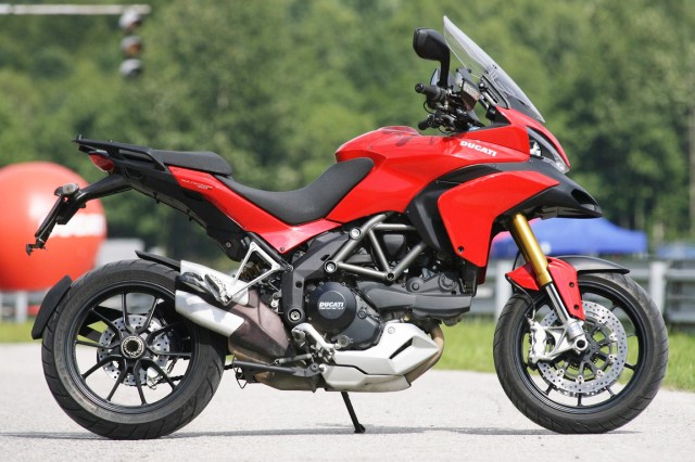Dokładnie takie same wrażenia uzyskujemy na Ducati Multistradzie 1200S. Z wizualnej strony jest zdecydowanie mniej agresywny niż Mercedes, jednak jak na „turystyka” jego stylizacja jest bardzo radykalna. Motocykl jest duży, siedzimy na nim wysoko w wyprostowanej pozycji. Cud, miód dla ludzi ceniących sobie komfortową jazdę. Do wyboru mamy 4 tryby pracy: Sport, Touring, Urban i Enduro. Najbardziej relaksujące będą ustawienia miejskie. Motocykl ma wtedy ograniczoną moc, zawieszenie jest miękkie, a reakcja na gaz potulna jak baranek (taki trochę naszprycowany metanabolem). Nawet podczas pracy na mapach zapłonu obniżających moc maksymalną, silnik typu L-2 o pojemności 1198 ccm zaskakuje swoją elastycznością. Podróżując przez kolejne ustawienia odkrywany pokłady mocy, które nie były nigdy wcześniej dostępne w żadnym turystycznym enduro.