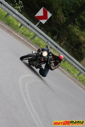 „Retro” jazda na kole przydarza się tu nader często po wyjściach z zakrętów. Naturalnie największą obawę stanowi podwozie. Dopiero tutaj znajdujemy istotne ograniczenie w postaci układu hamulcowego. Ta skromna pojedyncza tarcza z jeszcze bardziej skromnym, dwutłoczkowym zaciskiem naprawdę nie jest adekwatną propozycją w zestawieniu z potencjałem silnika. Mam wrażenie, że hamowanie silnikiem przynosi tutaj porównywalny efekt do naciśnięcia dźwigi przedniego hamulca, a to jest naprawdę rozpaczliwy wniosek.