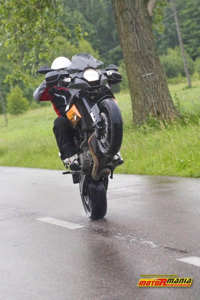 Wspaniały wzrost mocy oraz momentu obrotowego powoduje znaczne zwiększenie możliwości trakcyjnych (co stało się tym bardziej ewidentne, że testowaliśmy na mokrej nawierzchni). Podczas podnoszenia motocykla na jedno koło pod gaz, ani razu nie przydarzył się najmniejszy nawet uślizg. Ta progresywna reakcja silnika przyczyniła się do przyczepności znacznie bardziej. niż slicko-podobne opony firmy Continental. Jeżeli wspomnę, że na jedno koło 990 SM T wspina się równie chętnie na trzecim jak na pierwszym biegu, powinno to dać wyobrażenie słodyczy jednostki napędowej. Mokra nawierzchnia nie pozwoliła nam zbliżyć się do limitów podwozia, ale odczuwalny potencjał był zachwycający. Rozmieszczenie masy i zmiana kierunków są wysublimowane. KTM 990 SM T zawsze jedzie dokładnie w pożądanym przez ciebie kierunku. Robi to ochoczo, precyzyjnie i pod wpływem delikatnych zaledwie nacisków na kierownicę. Zawieszenie niweluje nierówności nawet na najbardziej paskudnych nawierzchniach utrzymując oponę bezwzględnie przyklejoną do asfaltu, również podczas trudnych warunków atmosferycznych. No i komfort jazdy rzez cały czas jest nadzwyczajny.