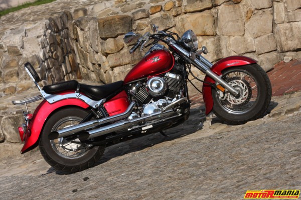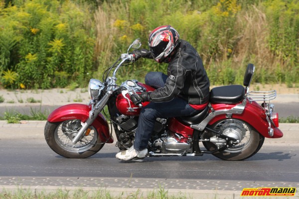 Wersja Classic sama w sobie jest opcją bogatą, ale w naszej testowej maszynie mieliśmy do czynienia z kilkoma dodatkowymi akcesoryjnymi gadżetami. Seryjne podnóżki zastąpiono ogromnymi podestami (swoją drogą, to właśnie one ograniczają pochył motocykla i pierwsze trą o asfalt). Zamontowano całkiem nieźle brzmiący wydech. Szkoda tylko, że słychać go dopiero na wysokich obrotach, a silnik nie lubi kręcenia po czerwonym polu i szybko buntuje się w tych rejonach. Dołożono również tzw. sissy bary, których osobiście nie lubię, ale wiem, że wśród motocyklistów mają całe rzesze wiernych fanów. Ogólnie wszystkie te dodatki całkiem nieźle współgrają z całością wyglądu motocykla. A jaki to wygląd? Klasyczny jak to na cruisera przystało. Nie bawiono się tutaj w stylistyczne fajerwerki, diody i neony. Ma być klasa i jest.