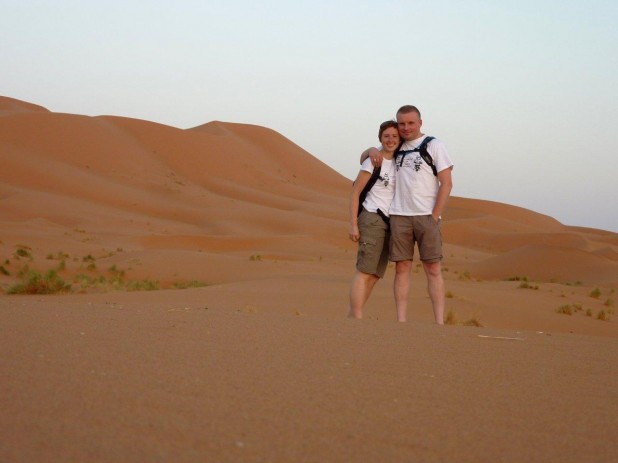 U bram Sahary, w Merzoudze, jesteśmy już na dobre przesyceni „gościnnością” majfrendów. Tu szczególnie mocno to odczuwamy. Jest popołudnie, żar leje się z nieba, jest około 45 stopni Celsjusza. Powietrze jest tak gorące, że próba otwarcia wizjera w kasku w celu przewietrzenia się kończy się jeszcze szybszym jego zamknięciem. Przyczepia się do nas majfrend krążąc między nami na swoim motorowerku i proponując nocleg. Irytacja powoduje, że Patryk i transalp zaliczają glebę na piaszczystej ścieżce, majfrend stoi nad nami dalej gadając o swojej ofercie podczas gdy my , spływając potem z upału i złości, podnosimy obładowanego transalpa z grząskiego piachu. W końcu majfrend odpuszcza tłumacząc, że jak pojedziemy tą drogą dalej, to będzie więcej piasku. Niestety ma rację… Po pokonaniu zapiaszczonego odcinka znajdujemy europejską oazę na pustyni. Daleko od naszej kultury, w środku ramadanu, urocza starsza Francuzka, która prowadzi niewielki, bardzo przyjemny pensjonat, częstuje nas wspaniałą kolacją – chłodnikiem z ogórków i kwiatu pomarańczy, kuskusem, ciastem czekoladowym i… zimnym piwem. Opowiada o tym jak się tu osiedliła, skąd się biorą tutejsze wydmy, oraz o tym jak kilka lat temu ten pustynny teren nawiedziła ogromna powódź. Wieczorem z jednej z wydm podziwiamy przepięknie rozgwieżdżone niebo, jakiego jeszcze nigdy w życiu nie widzieliśmy i kąpiemy się w dużym basenie. Ta odmiana bardzo nam się przydaje.