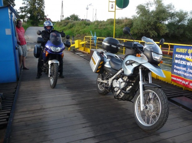 Pokusa wyposażenia naszych nowych motorów w najlepszy sprzęt podróżniczy, w tym metalowe kufry, skomplikowane GPSy itp. była niemała. Nie tędy jednak wiodła nasza droga. Chcieliśmy udowodnić, że aby pojechać na taką wyprawę wystarczy podstawowy sprzęt, który jest w zasięgu każdego motocyklisty. Kufry zostały plastikowe – dokładnie takie z jakimi kupiliśmy motocykle, GPS owszem, ale w postaci aplikacji na telefon komórkowy za 11 zł i papierowa mapa, a z dodatkowych akcesoriów transalp dostał automatyczną olejarkę do łańcucha. GS już taką miał. Ponieważ jechaliśmy tylko we dwoje, nie zdecydowaliśmy się na przerzut motocykli na Gibraltar busem, ale na przejechanie całej trasy na kołach. No, prawie całej – trzy razy wsiedliśmy na prom – dwa razy przeprawiając się pomiędzy Europą i Afryką i raz… tuż po wyjechaniu za Kraków – okazało się, ze najkrótsza droga z Krakowa do Bratysławy wytyczona przez nasz GPS prowadzi przez przeprawę promową na Wiśle.