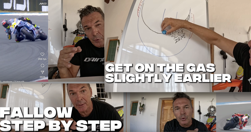 6) Czwartek – jazda w drugą stronę na torze Copo. Zmiana kierunku toru pozwoli na dywersyfikację treningu i ponowne wdrożenie analiz przy innej konfiguracji jazdy. Dodatkowe ćwiczenia pozwolą skoncentrować się na poprawnym patrzeniu i poprawie pozycji ciała. Jak zawsze, będziecie korzystać z rejestratora danych Racebox, a Wasza praca będzie filmowana, aby lepiej zrozumieć, co robicie dobrze, a co należy zmienić.