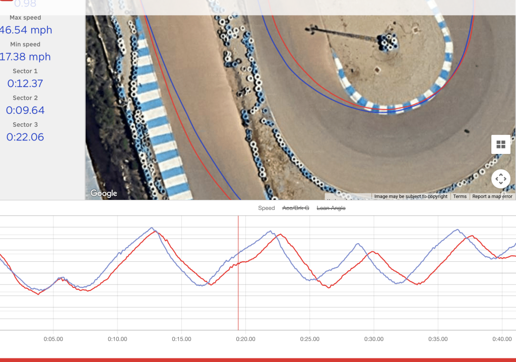 Podczas czterech dni pracy na asfaltowym torze wyścigowym, po każdej sesji będziesz miał dostęp do wielu podstawowych danych analitycznych ( siły hamowania, dynamiki przyspieszenia, kątów złożenia, punktów skrętu, linii przejazdu). Nałożysz swoje okrążenia na okrążenie optymalne i porównasz je. Przeanalizujesz wykresy, takie jak ten poniżej, wybierzesz element do poprawy przy kolejnym wyjeździe – poprawisz wyniki w kolejnej sesji.
