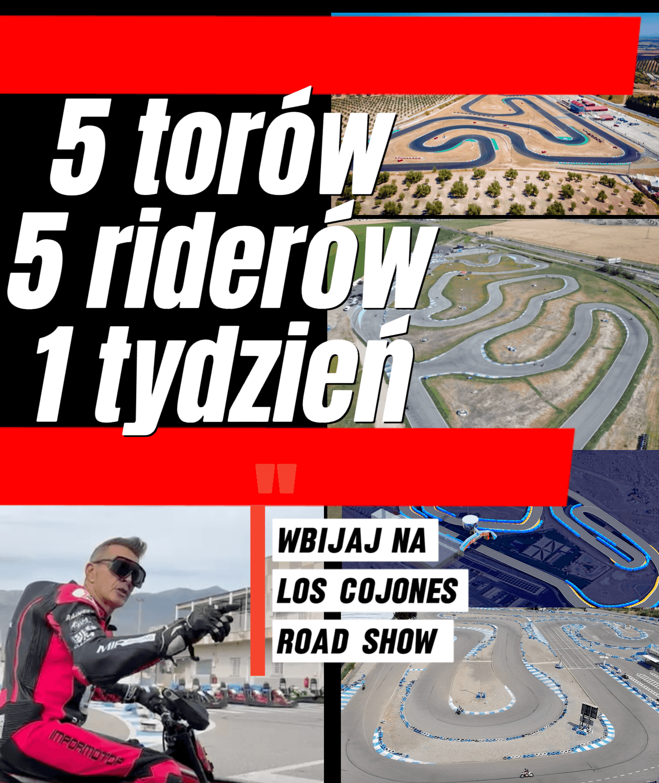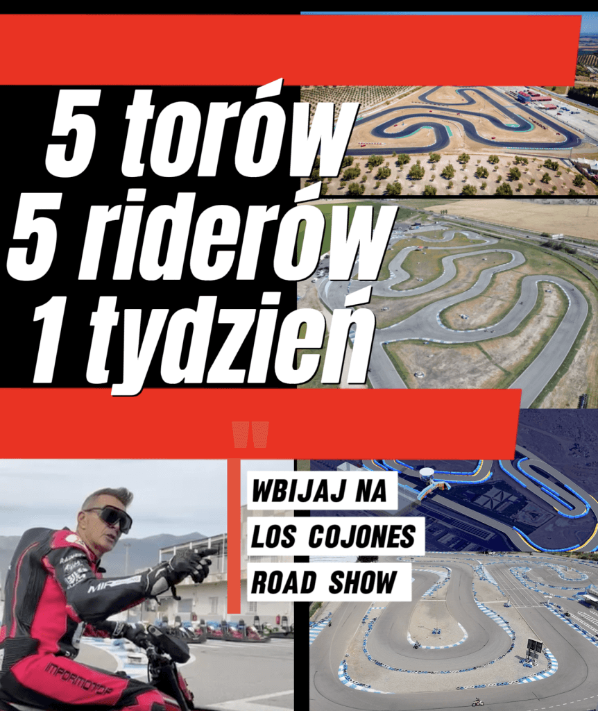 Hiszpania: 5 riderow, 5 różnych torow, 5 dni treningowych. Kameralna grupa, codziennie nowe wyzwanie, codzienna praca z data loggerem i analizą danych telemetrycznych, codzienne nagranie Twojej jazdy, pozycji i linii przejazdu oraz praca nad ich poprawieniem. Na pełnej koncentracji, efektywnie, i bez kompromisów – zapraszamy na Los Cojones Road Show. Musisz się tylko spakować i stawić się na lotnisku w Maladze – motocykle, paliwo, opłaty torowe, 6 noclegów, szkolenie, data logger i transport masz w cenie turnusu, która wynosi 1490 euro ( 1000 euro płatne przy rezerwacji, i 490 euro na miejscu po przyjeździe).